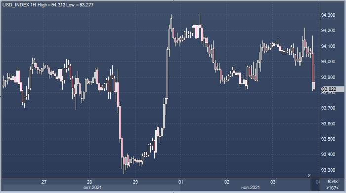 Доллар подешевел вечером в среду, 3 ноября, после того как Федеральная резервная система США анонсировала с ноября начало сокращение программы покупки активов на $15 млрд в месяц ($10 млрд казначейские облигации и $5 млрд обеспеченные ипотекой агентские бумаги). ФРС вновь охарактеризовала инфляцию, как «временную», поэтому борьба с ней не потребует быстрого повышения ставок. Регулятор также указал, что перебои в глобальных цепочках поставок повышают инфляционные риски, однако «ожидается, что они окажутся временным явлением».