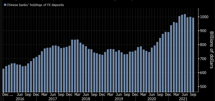 Банковские депозиты в иностранной валюте чуть не дотягивают до рекорда в $1 трлн долларов, в то время как, по оценкам Morgan Stanley, положительное сальдо торгового баланса за первые девять месяцев этого года достигло примерно $440 млрд по сравнению со средним показателем в $336 млрд в 2015-2019 годах и $325 млрд в 2020 году.