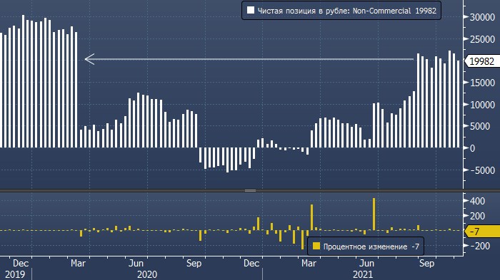 Чистая длинная спекулятивная позиция (категория «Non-Commercial») по рублю снизилась за неделю до 2 октября примерно на 7%, однако продолжает оставаться в области рекордно высоких значений с марта 2020 года. Об этом говорят опубликованные в пятницу, 5 октября, цифры американской Комиссии по торговле товарным фьючерсами.
