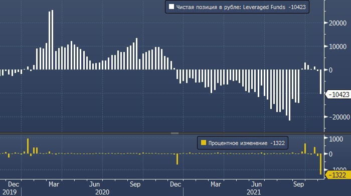 При этом сальдированная позиция по рублю тех участников рынка, которые торгуют с кредитным плечом (категория «Leveraged Funds», наиболее агрессивные спекулянты), не только остается короткой вторую неделю подряд, но за последний отчетный период она выросла в 14 с лишним раз (рекордное значение с 2015 года) и достигла максимума с середины сентября.