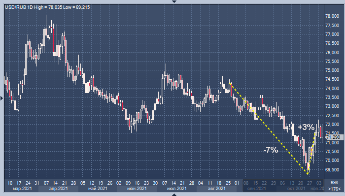 За неделю до 2 октября рубль подешевел к доллару примерно на 3%. За два месяца, предшествовавшие последнему отчетному периоду, рубль подорожал к доллару почти на 7%.