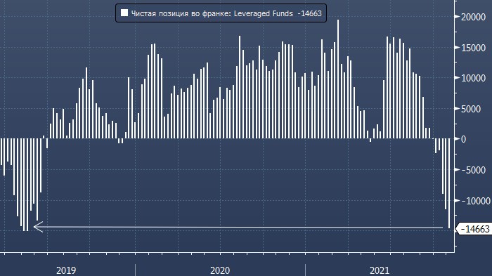 Также Leveraged Funds заметно отметились в швейцарском франке: здесь их чистая короткая позиция достигла максимального значения с мая 2019 года.