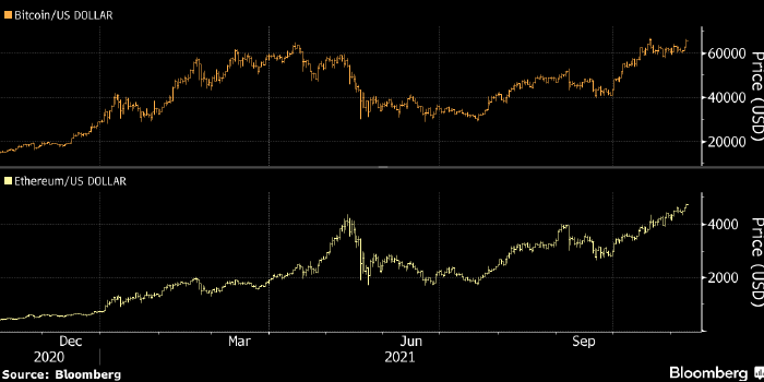 График цены биткоина (сверху, оранжевым) и эфириума (внизу, желтым). Источник: Bloomberg