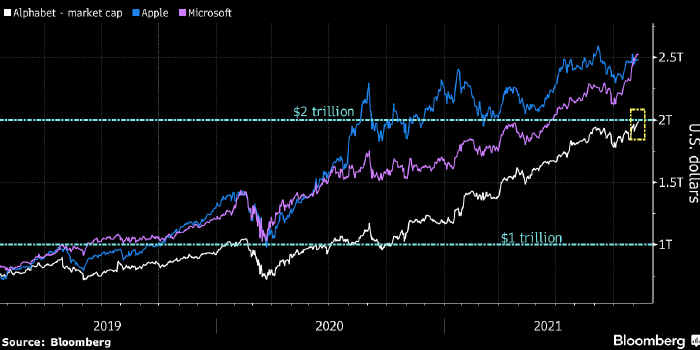 Таким образом, компания Ларри Пейджа и Сергея Брина стала третьей в США, кому удавалось хотя бы ненадолго достичь капитализации в $2 трлн: первым это сделал Apple (август 2020 года), а вторым — Microsoft (июнь 2021 года).