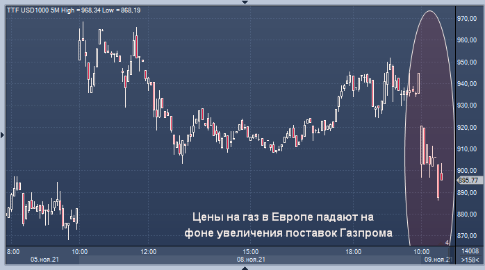 Цены на природный газ на биржах в Европе упали утром во вторник почти на 6%: Россия выполнила обещание нарастить потоки голубого топлива после заполнения российских ПГХ. Поставки природного газа по газопроводу "Ямал-Европа", то есть в Германию через Белоруссию и Польшу, и украинский ужгородский газотранспортный коридор выросла почти в 2,5 раза к утру 9 ноября до почти 860 тыс. куб. м в час, согласно данным европейского газотранспортного оператора Gascade. Это увеличение соответствует поручению Владимира Путина о пополнении запасов в хранилищах в Европе.