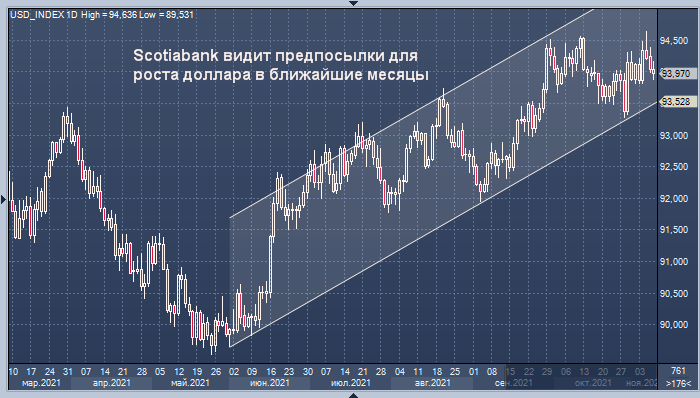 Аналитики Scotiabank видят предпосылки для дальнейшего роста доллара. По их мнению, поддержку американской валюте окажет сокращение программы покупки активов, о котором ФРС объявила в прошлую среду, 3 ноября, и которое станет прелюдией к повышению ставок.