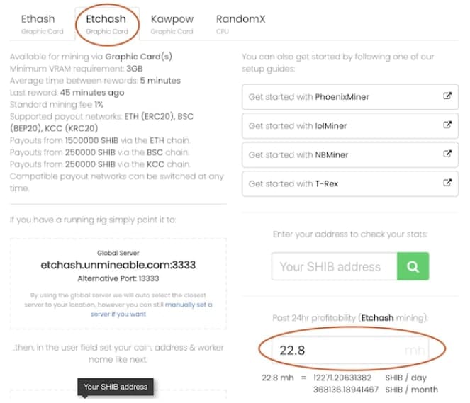 Страница добычи сиба-ину, unminable.com. Данные unminable.com
