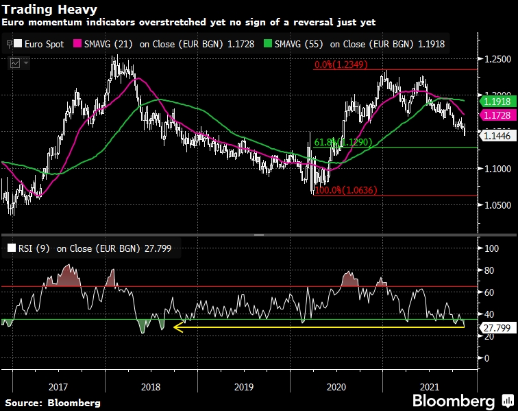 Похоже, что пара евро/доллар намерена протестировать ключевой уровень Фибоначчи на 1,1290, поскольку медвежий импульс остается сильным; по системе DeMark в понедельник на 9 баре недельного графика сформируется сигнал на покупку; индикаторы импульса (моментума) не показывают признаков разворота, но стоит отметить, что девятинедельный RSI находится на максимальном уровне перепроданности с августа 2018 года.