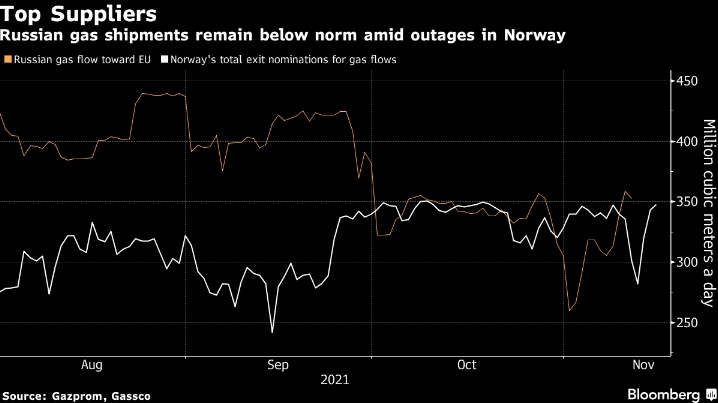 Тем временем температуры падают, и Европа сталкивается с первым зимним похолоданием. Потоки газ из Норвегии, второго по величине поставщика в регионе, также недостаточны. Гигантское месторождение Troll в Норвегии сократит мощность на 28% в течение трех дней, начиная со вторника, из-за «отказа компрессора», сообщил сетевой оператор Gassco AS. Это произошло из-за сбоя в электроснабжении, в результате которого были прекращены поставки на перерабатывающий завод Карсто на прошлой недели.