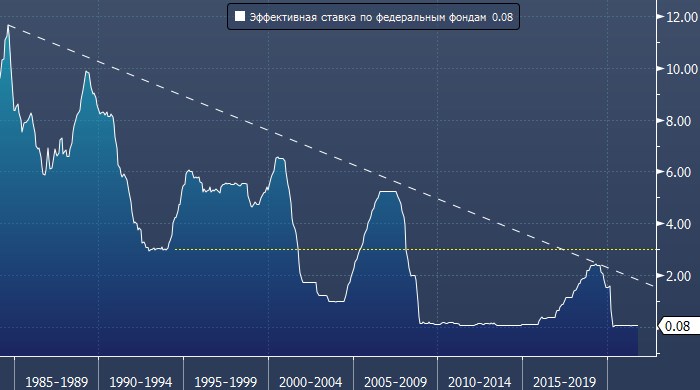 Текущий целевой уровень ставки по федеральным фондам составляет 0–0,25%, и ФРС планирует сохранять ее здесь до тех пор, пока не будут удовлетворены три условия: 1) достижение полной занятости, 2) достижение инфляции на уровне 2% и 3) обеспечение устойчивого прогноза о том, что инфляция на некоторое время умеренно превысит 2%.