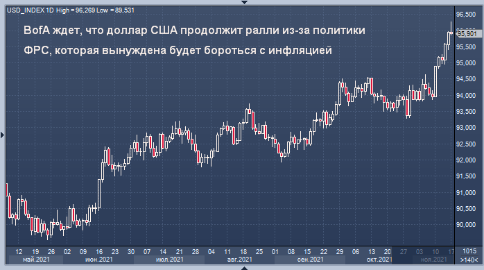 Bank of America утверждает, что борьба Федерального резерва синфляцией может обернуться усилением доллара США. Поскольку потребительские цены растут самым быстрым темпом за последние три десятилетия, центральному банку, возможно, придется признать, что значительная часть этого роста отражает перегрев экономики, написал аналитик Афанасиос Вамвакидис в записке вторник.