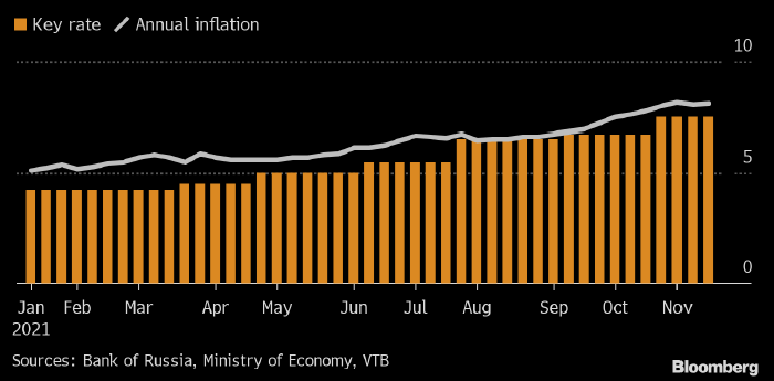 В октябре потребительская инфляция в РФ достигла рекордного за последние пять лет значения в 8,1% г/г несмотря на то, что с начала года ЦБР повысил ключевую ставку уже на 3,25%.