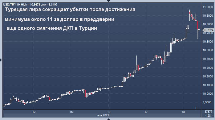 В четверг турецкая лира упала до исторического минимума - около 11 за доллар, прежде чем нивелировать некоторые потери в преддверии заседания центрального банка, которое, как ожидается, закончится дальнейшим снижением ставок, даже несмотря на девальвацию нацвалюты и инфляцию около 20%.