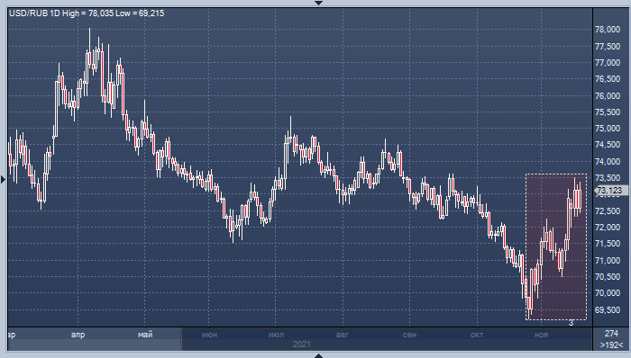 Подобное предположение подпитывается сильными фундаментальными факторами: благодаря высоким ценам на нефть и газ торговый баланс РФ, равно как и сальдо счета текущих операций, остаются в области исторических максимумов, а рынок ждет дальнейшего повышения ключевой ставки Банком России. В настоящий момент ее реальное значение, т. е. с поправкой на инфляцию, находится чуть ниже нуля (7,5% против ИПЦ за октябрь на уровне 8,1% г/г). Однако вскоре, при прочих равных, она может выйти в плюс и тем самым оказать поддержку российской валюте.