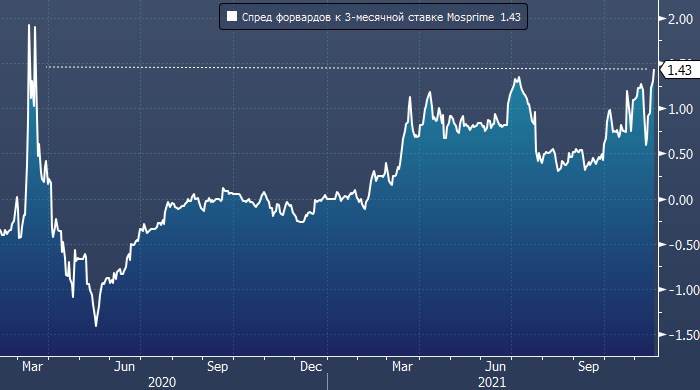Участники рынка производных инструментов заложили в цены ожидания того, что в ближайшие три месяца Банк России повысит ключевую ставку на 1,50%, т. е. до 9%. Об этом говорит динамика спреда форвардных соглашений и 3-месячной ставки Mosprime, который достиг рекордного уровня с кризисного марта 2020 года.