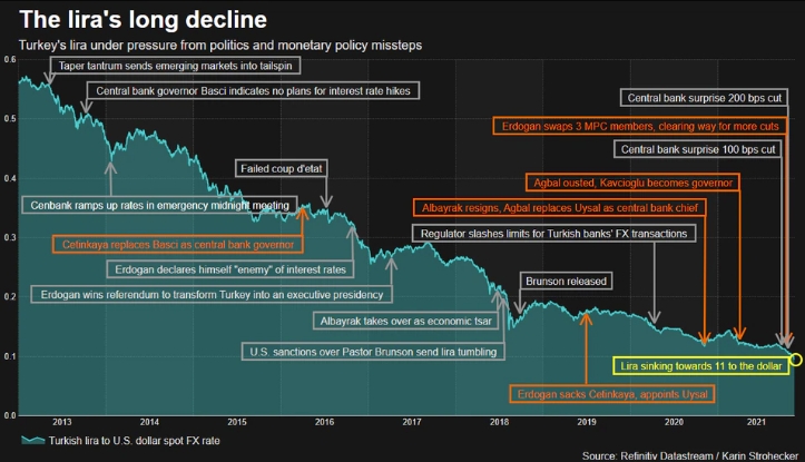 Распродажа валюты, которая подстегивает цены на импорт, резко обострилась, когда в сентябре центральный банк стал "голубем", а позже начал снижать ставки, даже когда инфляция поднялась почти до 20%.