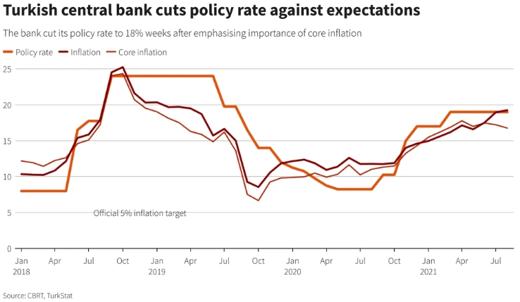 Считается, что центральный банк Турции подчиняется призывам Эрдогана к стимулированию экономики, продолжая то, что аналитики считают безрассудным циклом смягчения, учитывая обвал лиры и рост инфляции.