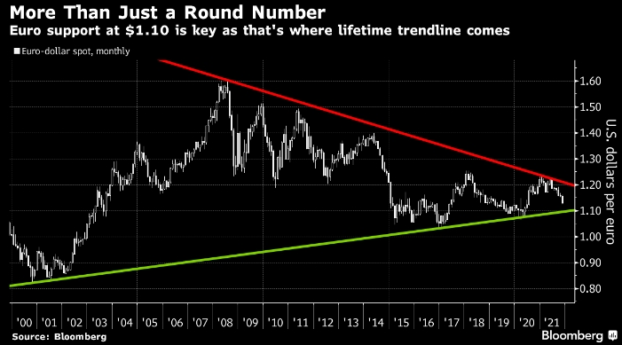 Снижение настроений в Европе заставляет трейдеров и инвесторов смотреть на следующую красную линию - 1,10 доллара, где проходит линия тренда, существующая с 1999 года. Стратеги UBS Group AG и HSBC Holdings Plc прогнозируют падение евро до этого уровня к концу 2022 года, поскольку трейдеры ждут, что Европейский центральный банк сохранит стоимость заимствований на рекордно низком уровне, в то время как Федеральная резервная система переходит к повышению ставок.