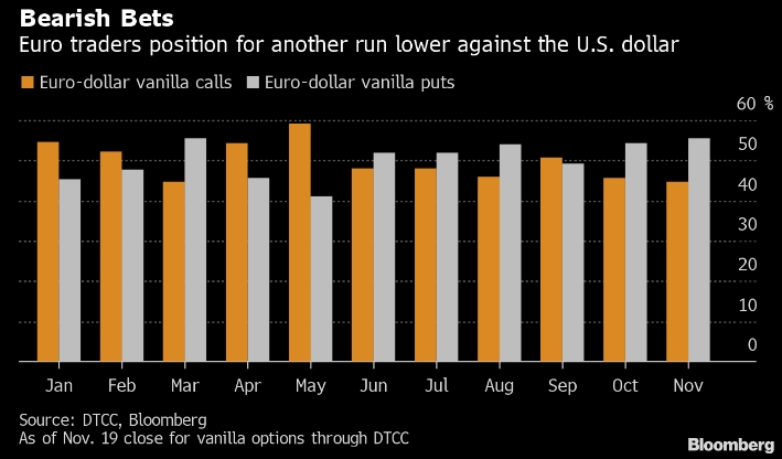 Спрос на опционы, которые приносят прибыль в случае ослабления евро, является самым дорогими в этом году, показывают данные Depository Trust & Clearing Corporation. Между тем, «бычьи» ставки составляют всего 44,5% от общего интереса к ванильным опционам в этом месяце, что сравнимо с разбивкой, наблюдавшейся восемь месяцев назад.