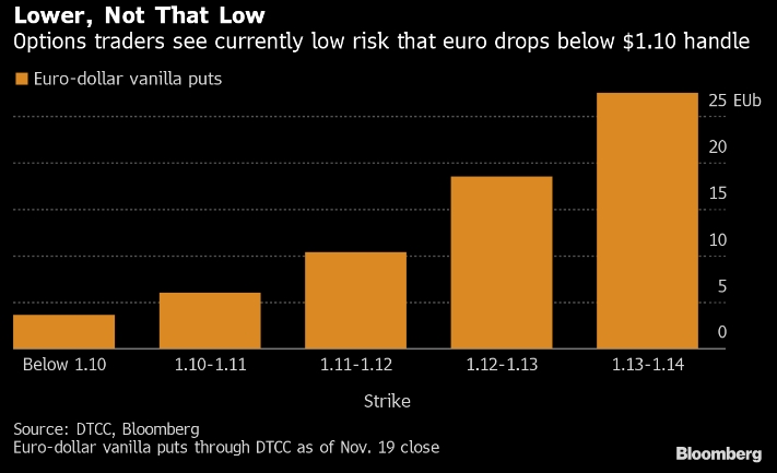 В то время как трейдеры опционов видят только 22% вероятность того, что евро упадет до 1,10 доллара к концу этого года, вероятность того, что это произойдет к первому кварталу 2022 года, возрастает до 50%. По данным Bloomberg, трейдеры видят в 64% вероятности, что это произойдет к концу следующего года.