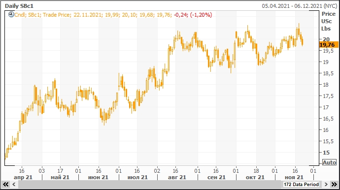 Мартовский фьючерс на сахар-сырец потерял 0,2% до 19,76 цента за фунт, продолжив падение рынка с максимума за 4 с половиной года в 20,69 цента, установленного на прошлой неделе.