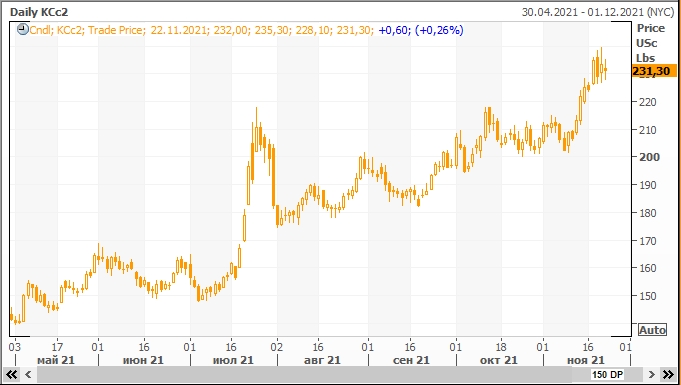 Дилеры считают, что рынок способен на краткосрочную коррекцию после недавнего сильного роста, но настроение оставалось бычьим, биржевые запасы падали, а производители в Бразилии неохотно продавали. Несмотря на высокие цены, продажи кофе следующего урожая в Бразилии за последний месяц выросли незначительно из-за неопределенности производства и ожиданий дальнейшего роста цен, сообщило в пятницу консалтинговое агентство Safras & Mercado. Объем продаж урожая в 2022/23 году крупнейшего в мире производителя и экспортера кофе увеличился всего на один процентный пункт за месяц, до 12 ноября, до 26% от его производственного потенциала. Преобладает мнение о том, что цены все еще могут расти, поскольку они не полностью отражают потери, нанесенные в этом году заморозками и продолжительной засухой, для потенциального урожая следующего бразильского урожая. Так что производители затягивают и максимально откладывают продажи.