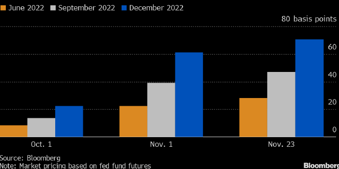 Ожидания по росту ставки по федеральным фондам (в базисных пунктах, исходя из динамики фьючерсов) к июню 2022 года (оранжевым), к сентябрю 2022 года (белым) и к декабрю 2022 года (голубым) по состоянию на 1 октября, 1 ноября и 23 ноября. Источник: Bloomberg