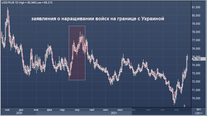 Курс российской валюты снижается четвертый день, а ставка инверсии риска по трехмесячным опционам на рубль, которая отражает стоимость хеджирования от падения курса, взлетела до пика с апреля этого года, когда в последний раз США «выражали обеспокоенность» наращиванием войск РФ на российско-украинской границе.