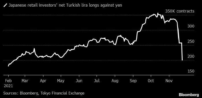 Недавний обвал курса турецкой лиры по всему спектру рынка спровоцировал именно такое событие: японские розничные инвесторы бросились закрывать ставки на рост турецкой валюты, в результате чего они опустились до минимального значения с февраля. По данным Tokyo Financial Exchange, на которые ссылается Bloomberg, снижение этого показателя с пиковых значений октября составило 44%. При этом около 30% всех ордеров на продажу турецкой лиры было обусловлено маржин-коллами, т. е. принудительным закрытием позиций (данные Gaitame.com Research Institute).