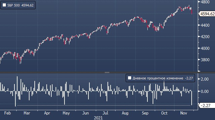 Пятница, 25 ноября, оказалась для инвесторов во всех смыслах черной: новости о появлении нового варианта коронавируса, который назвали омикроном, спровоцировали снижение S&P 500 на 2,27%, что стало рекордным значением с конца февраля, когда индекс потерял 2,45%. По итогам торгов снизились все 11 секторов S&P 500, хотя утром сектор здравоохранения пытался расти, что выглядело логичным в виду перспектив ухудшения эпидемиологической ситуации.