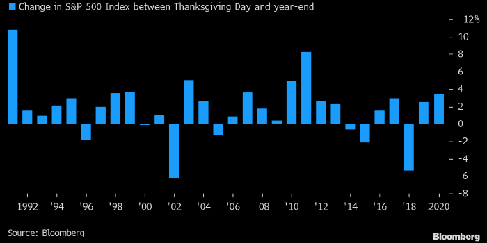 Процентное изменение S&P 500 в период между Днем благодарения и Новым годом. Источник: Bloomberg