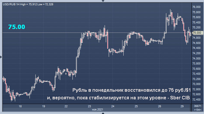 Вероятна консолидация цены нефти марки Brent около уровня $75 за баррель на торгах в понедельник, говорится в аналитическом материале Sber CIB. Доходность российского госдолга, вероятно, не вырастет ещё больше, считают эксперты инвестбанка. Однако восстановлению на рынке рублевых облигаций, по их мнению, может помешать ожидание инвесторами решения Минфина по аукционам. Рубль в понедельник восстановился до 75 руб./$1 и, вероятно, пока стабилизируется на этом уровне, полагают в Sber CIB.