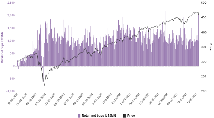 Гистограмма отражает объем чистых покупок розничными инвесторами биржевых фондов на рынке акций США в млн долларов (левая шкала), а черная линия отражает динамику SPY (биржевой фонд, ориентированный на S&P 500, правая шкала). Источник: Vanda Research