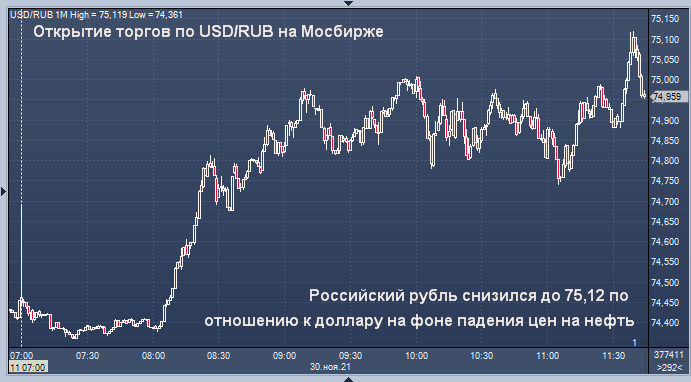 Во вторник утром рубль слабел до 75 долларов по отношению к доллару, так как цены на нефть, ключевой экспорт России, всего за три дня упали почти до 70 долларов за баррель с более чем 80 долларов, оказав давление также на фондовые индексы. Утром падение нефти и мировых акций возобновилось: Глава производителя лекарств Moderna сообщил Financial Times, что вакцины COVID-19 вряд ли будут столь же эффективны против варианта коронавируса омикрон, как и против варианта дельта.