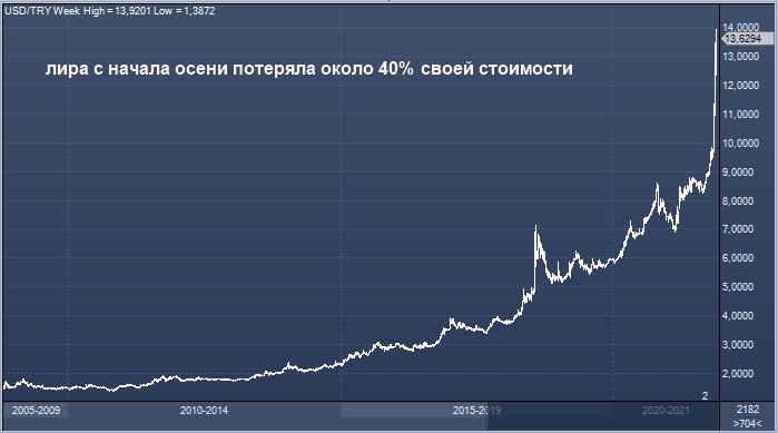 Лира продолжала терять в цене после комментариев Эрдогана, падая более чем на 6% к доллару США. Курс доллара по отношению к турецкой лире вечером во вторник, 30 ноября, вырос до 13,952, что является новым абсолютным максимумом для USDTRY. Турецкая лира с начала осени потеряла около 40% своей стоимости и обесценилась на 45% с начала 2021 года. Только в ноябре лира подешевела на 30% — и это худший для турецкой валюты месяц в истории.