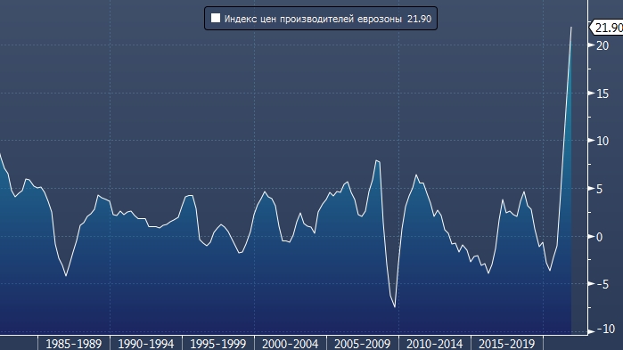 Статистическое управление Европейского союза Евростат сообщило, что цены на выходе с производственных линий в 19 странах, разделяющих евро, выросли на 5,4% в месячном исчислении при росте на 21,9% в годовом исчислении.