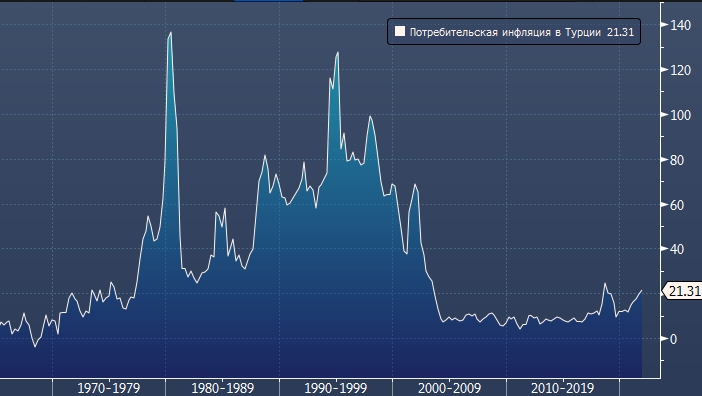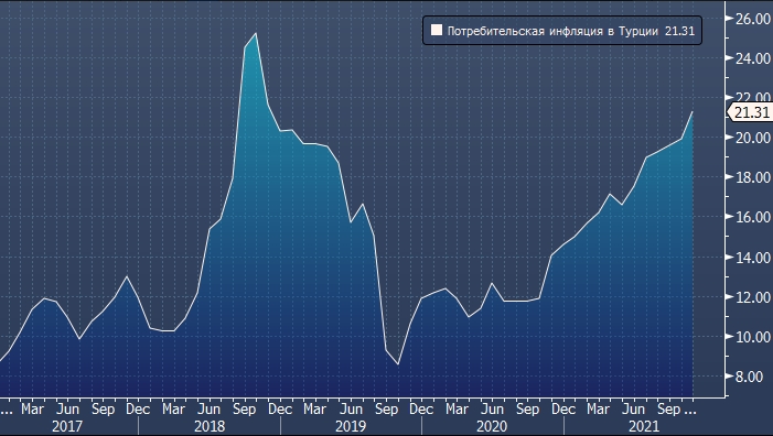 Инфляция в Турции ускоряется по мере падения лиры и роста цен на электроэнергию Лира торговалась на уровне 13,7342 за доллар по состоянию на 10:43 утра в Стамбуле. Турецкая потребительская инфляция ускорилась шестой месяц подряд в ноябре. В прошлом месяце цены выросли на 21,31% в год по сравнению с 19,89% в октябре. Это было быстрее, чем средняя оценка 20,7% в опрос 20 аналитиков Bloomberg.