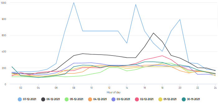 Суточная динамика цены электроэнергии на Nord Pool для Латвии в евро за МВтч. Различные линии обозначают различные дни с 30 ноября по 7 декабря. Источник: Nord Pool