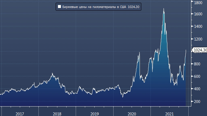 Цены на пиломатериалы выросли на 5% в четверг до 1024 долларов, снова превысив уровень в 1000 долларов за тысячу досковых футов, впервые ссередины июня, так как сырье испытывает повышенную волатильность на фоне кризиса в области логистики и устойчивого спроса со стороны строителей.