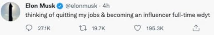 Миллиардер снова внезапно зашел в социальные сети, на этот раз чтобы написать в Твиттере, что он подумывает о том, чтобы уйти с должности генерального директора Tesla и SpaceX, что его поклонники восприняли как шутку.