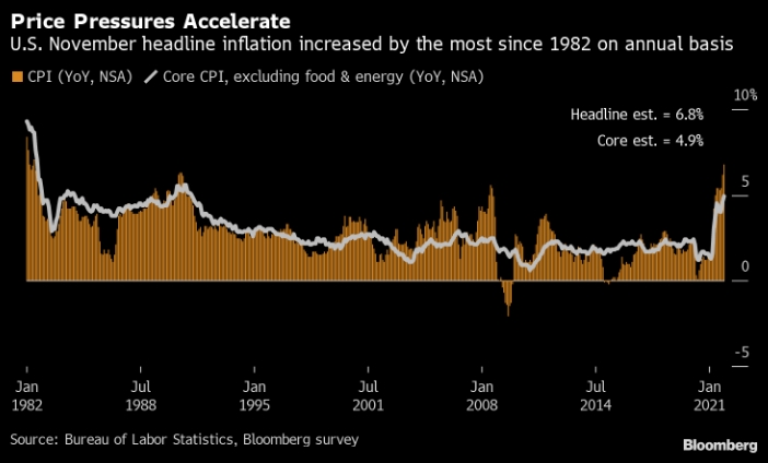 Потребительские цены в США росли в прошлом месяце самыми быстрыми темпами почти за 40 лет. Это подчеркивает, насколько быстрая и стойкая инфляция подрывает зарплаты и усиливает давление на Федеральный резерв с целью ужесточения политики. Индекс потребительских цен увеличился на 6,8% с ноября 2020 года, согласно данным Министерства труда, опубликованным в пятницу. Широко используемый показатель инфляции вырос на 0,8% с октября, превысив прогнозы и продолжив тенденцию значительного роста, начавшуюся в начале этого года. Медианные прогнозы в опросе экономистов Bloomberg предусматривают ежегодный прирост на 6,8% и рост на 0,7% в месячном исчислении.