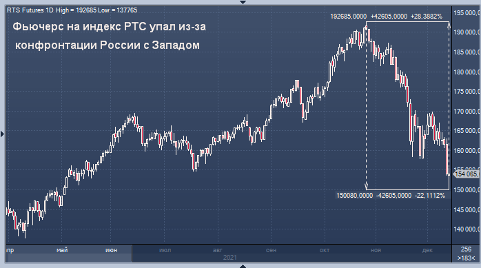 Продажи набирали силу изо дня в день. Рынок российских акций начал напоминать снежный ком, скатывающийся с горы. И, возможно, сегодня, судя по шипообразному отскоку, он, наконец, достиг склона этой горы. Вероятно, было слишком много игроков, державших позиции с плечом, что хватило даже столь незначительного повода, как выдуманная война, нарисованная опытными СМИ в головах неуверенных инвесторов, чтобы все это обрушить. Еще в конце октября фьючерс на индекс РТС был в районе 192 000, а сегодня утром он побывал в районе 150 000. Это лишний раз подчеркивает, насколько все еще спекулятивным остается отечественный рынок.