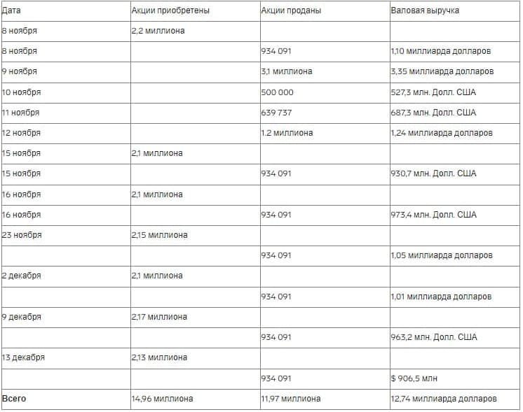 Вот таблица от Reuters, в которой показаны продажи акций Маска на данный момент: