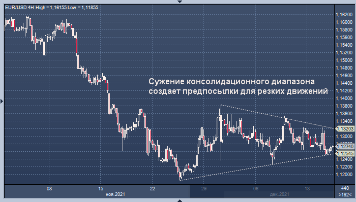 В середине ноября евро/доллар за дне недели снизился с $1,16 до $1,12 и с тех пор консолидируется в сужающемся диапазоне. Пара сжимается в спираль, что может предвещать резкие движения после заседаний регуляторов.