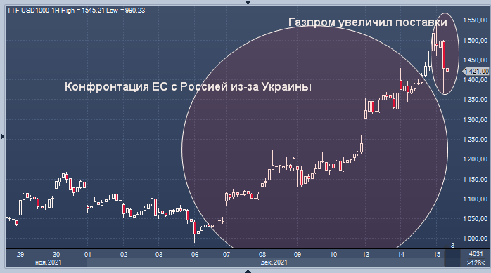 График цены ближайшего (январского) фьючерса на спотовый индекс газа TTF на бирже ICE Futures (в долларах США за тысячу кубометров) интервалами в 60 минут
