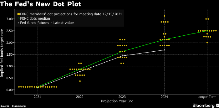 Обновленный прогноз членов FOMC по траектории ставок: желтые точки отражают прогноз отдельных членов FOMC, зеленая линия – их медианный прогноз, а белая линия — динамику фьючерсов на ставку. Источник: Bloomberg