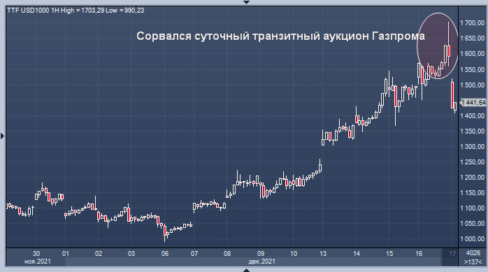 Как показали события в четверг, тем самым монополия получила большую власть на рыночной ценой на биржах Европы. Регулярный суточный аукцион бронирования, который прошел в четверг в обычное время по расписанию (окончился в 19:00 мск), завершился безрезультатно. В результате цена ближайшего (январского) фьючерса на TTF на бирже ICE Futures достигла 146 евро за МВт.ч, то есть $1714 за тысячу кубометров.