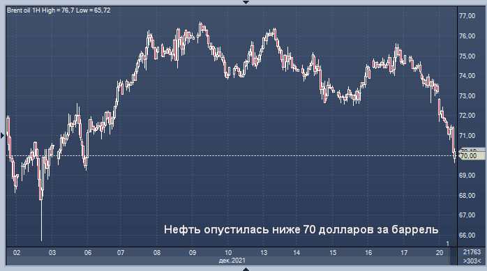 Brent продолжает падать и торгуется со снижением на 5,3% в Лондоне по состоянию на 9:07 утра по лондонскому времени. Мировой эталон торгуется по цене 69,60 долл. / барр. WTI также снижается, при этом февральский контракт снизился на 5,7% до 66,68 доллара.