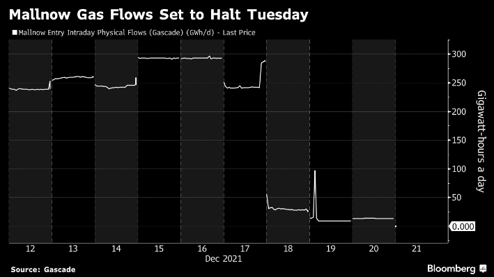 Цены на газ в Европе подскочили до самого высокого уровня с момента достижения рекорда в октябре из-за прекращения поставок российского газа по ключевому маршруту. Фьючерсы подскочили на 5,5% после того, как объем газа, поступающего на компрессорную станцию в Германии Мальнов, где заканчивается трубопровод Ямал-Европа, упал до нуля рано утром во вторник, согласно ранним утренним данным сайта сетевого оператора Gascade.