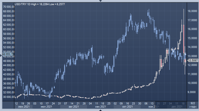 Графики доллара к турецкой лире и биткоина к доллару интервалами в 1 день